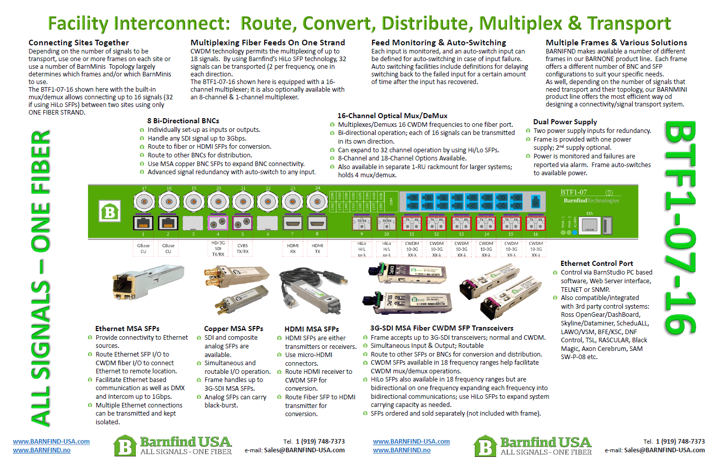 The BarnOne 41 Frame provide 16 SFP+ Ports/12G Capable. The BarnOne series of routers can provide a 32 x 32 built-in routing system with a combination of BNC and SFP I/O ports to satisfy any application.