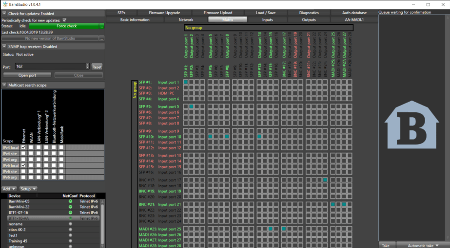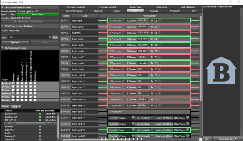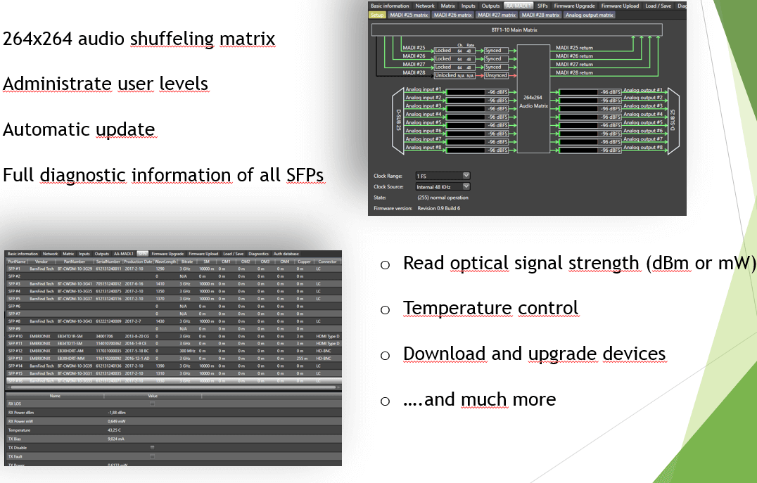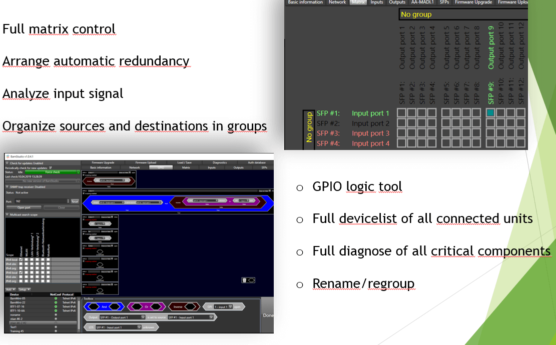 Our BarnStudio software comes included in the BarnOne frame price. BarnStudio gives you a quick and easy control setting, an overview of the input and output ports, re-clocking configurations, alarms, full matrix control, cable compensation on the input side, auto SFP detection, full diagnostic information and the possibility to save and load the configuration of your BarnOne frame to or from file.
